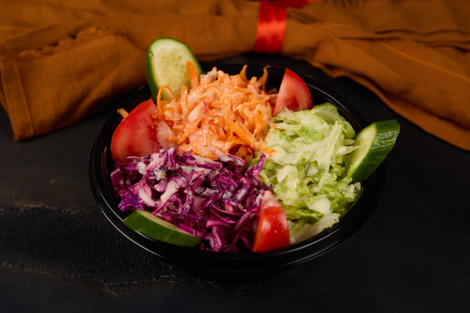 Sos, turşu, soğan, domates, yeşillik, peynir