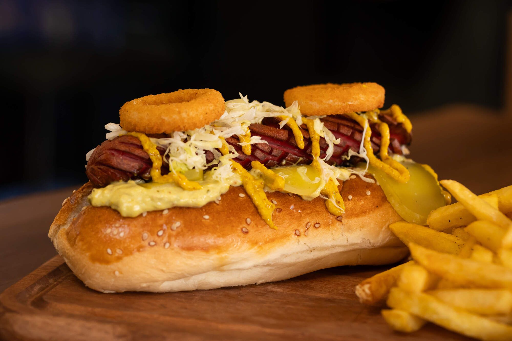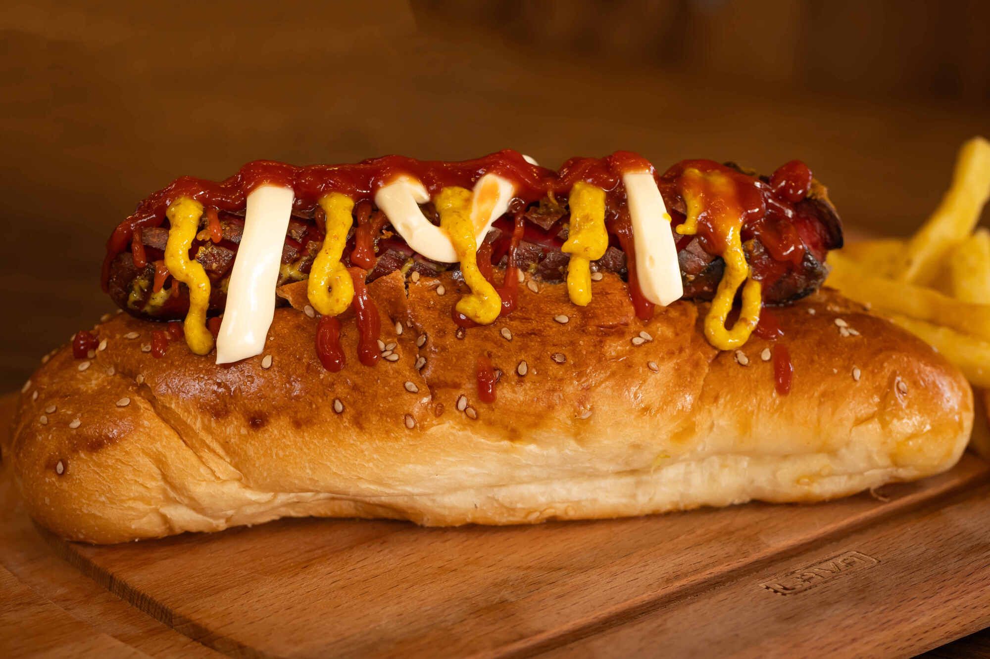 120 gr. et, özel sos, turşu, kapya biber, jalapeno biber, yeşillik, karamelize soğan, cheddar peyniri